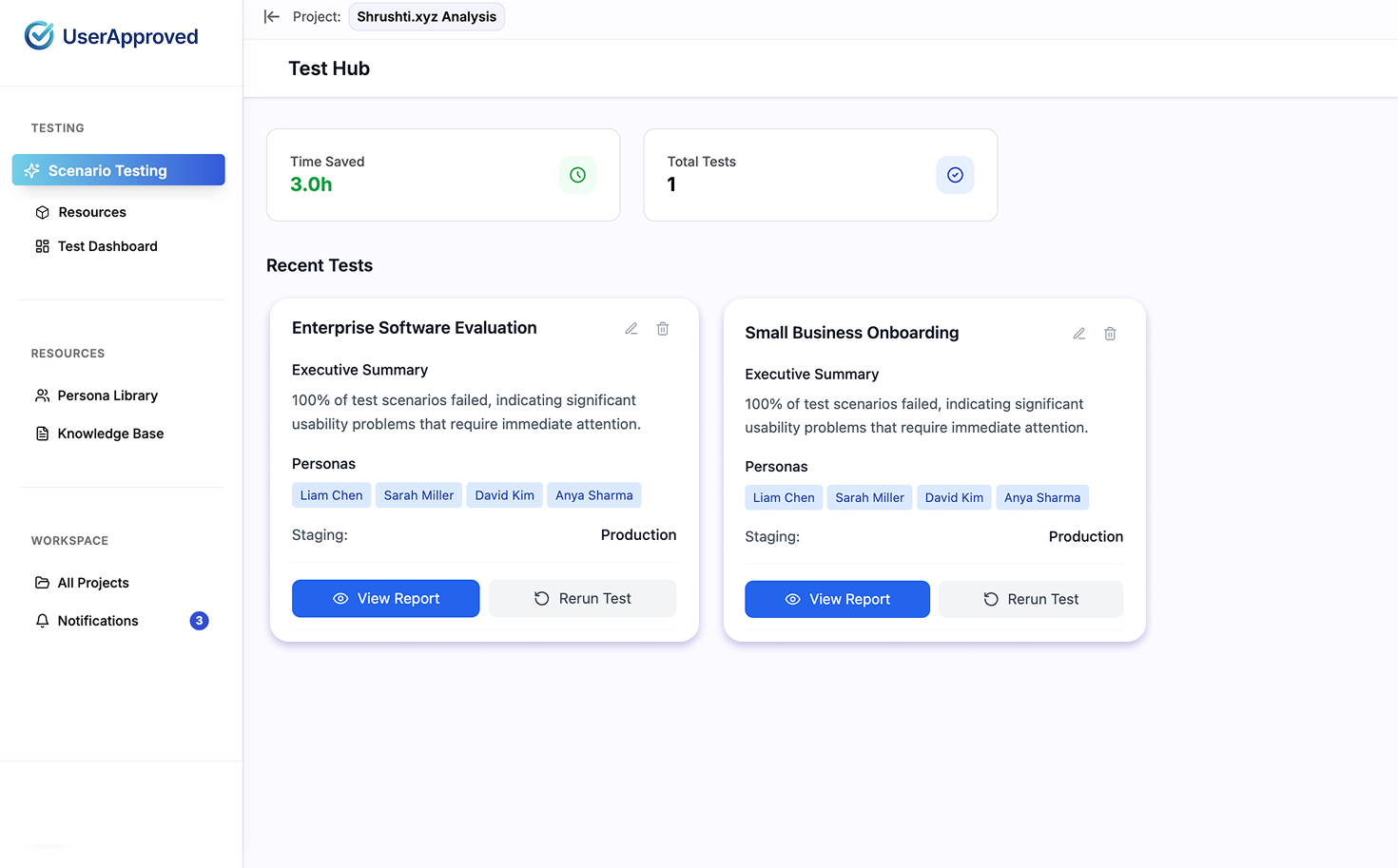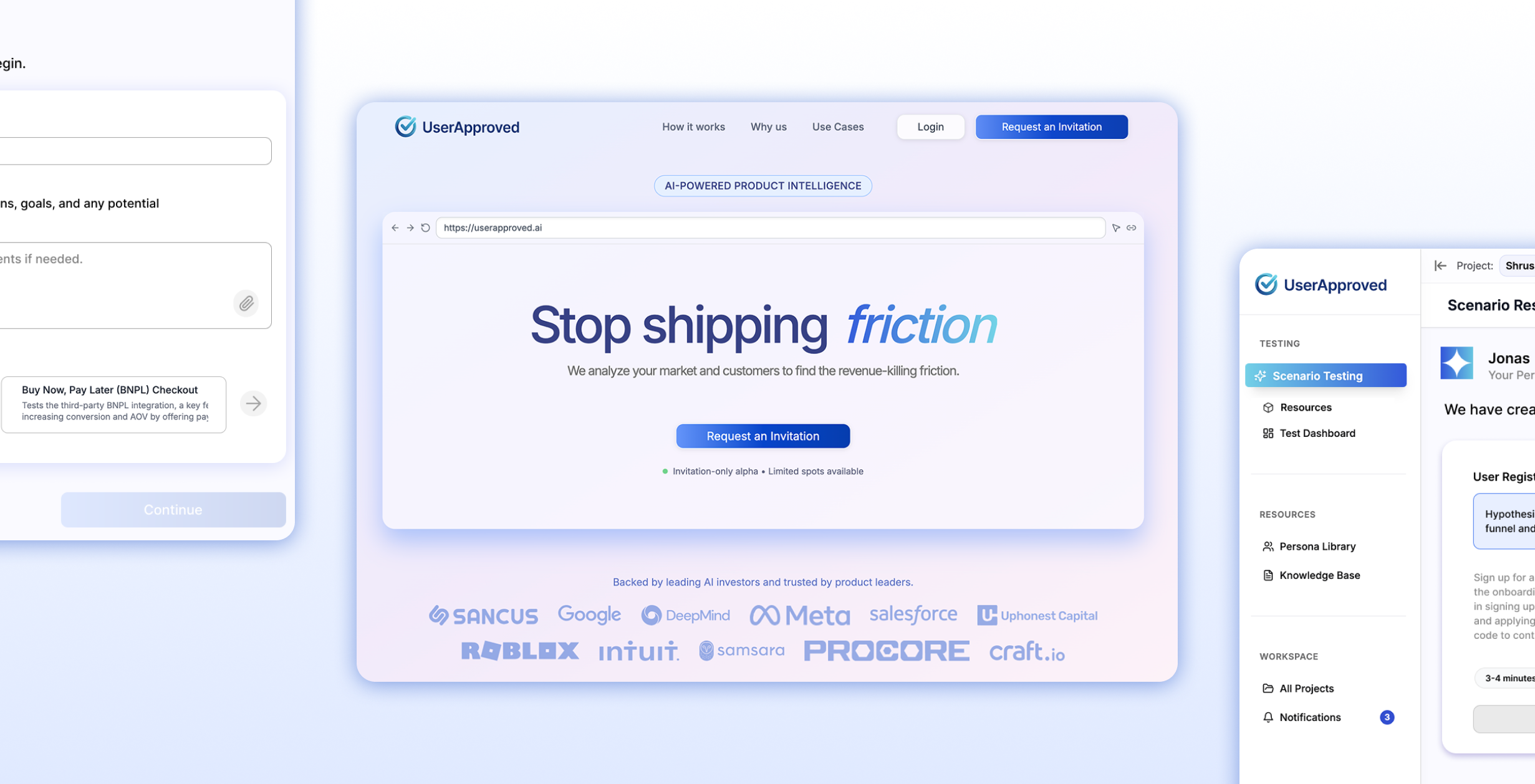 Userapproved simulates real users to find friction in user journeys (ie. checkout, onboarding) using customer and market research, personas, and testing validation to help teams improve and grow their product.